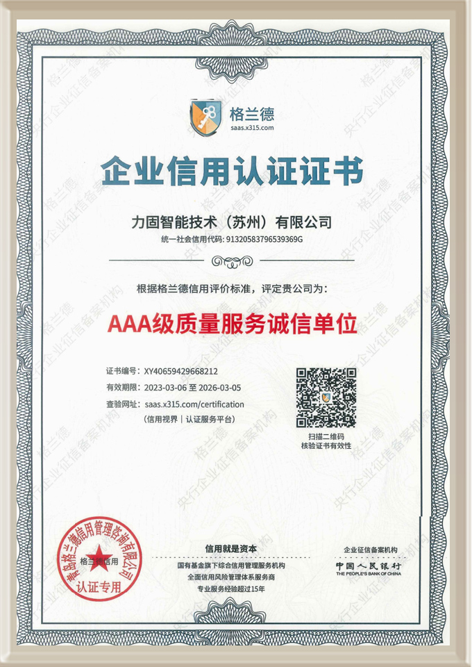 我司現(xiàn)已獲得GB/T19001-2016/ISO 9001:2015質(zhì)量體系認(rèn)證及江蘇省高新技術(shù)企業(yè)認(rèn)證,“力固”品牌聲譽(yù)日隆,有口皆碑。